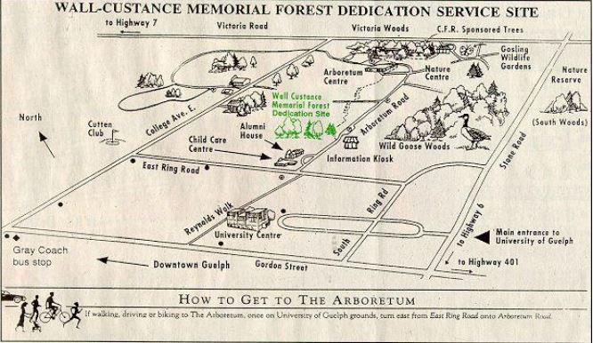 The Wall-Custance Memorial Forest is prominently located at The Arboretum at the University of Guelph. The Memorial Forest Dedication Grove can be found off of Arboretum Rd., just down from Alumni House. You can enter from the intersection of East Ring Rd. and Arboretum Rd.